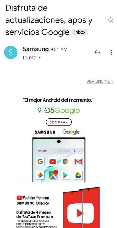 那么对于这位强劲的对手三星做了什么呢?--他们发起了一场Note 10活动以此来提醒消费者三星手机配备了所有谷歌应用和服务,并且还告诉他们,新款Galaxy Note有四个月的YouTube高级访问权限。以下是三星发布的促销邮件: