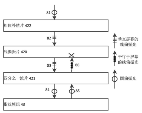 通常入射光一般为通常为圆偏振光或者是椭圆偏振光(如上图所示),若圆偏振光或椭圆偏振光直接入射到线偏振片上,则仅有少量光线能够通过。由于添加了相位补偿片422对经过显示屏41后的光线81进行相位补偿,使得经过相位补偿的后的光线能够顺利通过线偏振片420,保证了足够的照射到指纹模组上,不会影响指纹模组的性能;此外,被指纹模组表面反射的光线由于再次通过四分之一波片421,变为线偏振光,但振动方向旋转了90°因此无法再次通过线偏振片420。实现了阻止经指纹模组的反射后的光线再经过显示屏射出,避免用户观察到指纹模组所在位置与显示屏其他位置的颜色差异,提高终端的美观性。