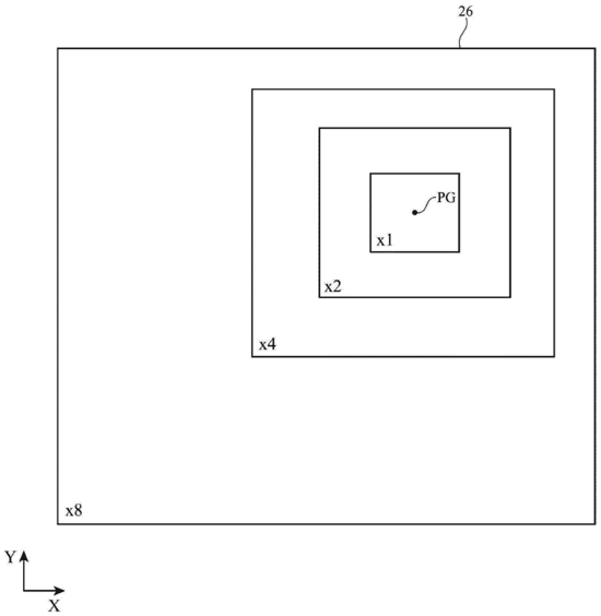 图二表示上述操作中的示例性中心凹形显示屏示意图,当获得注视跟踪系统的用户注视信息,比如在显示器的PG位置,图形处理单元根据这一信息对注视区域x1进行全分辨率渲染,以降低的分辨率,如全分辨率的1/2,1/4,1/8渲染周围图像数据。当用户的注视点发生移动时候,图形处理单元获取注视移动信息并调整用不同分辨率渲染图像数据的高分辨率区域和低分辨率区域的位置。