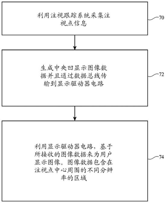 图三是基于此专利提出的电子设备进行用户注视凹形显示的流程示意图。在框70的操作期间,控制电路使用注视跟踪系统来搜集关于用户的注视点信息,并根据用户注视点移动动态更新屏幕上中心PG的位置信息。此后通过框72所描述的图形处理单元对不同区域进行图像渲染,并将图像传递给数据总线单元,此处与一般的全分辨率渲染整个画面相比,大大降低了处理功耗和数据带宽。框74所示操作中,显示驱动器电路将压缩数据传递给显示屏的像素阵列创建目标图像。由于PG处用户的视觉敏感度最高,因此无论用户注视何处,图像对于用户都是高质量的,而用户视觉周边部分的低分辨率内容由于敏感度差因此影响较小。