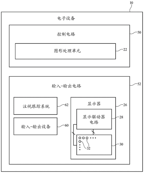 图一为包含有专利关键技术的示例性电子设备示意图,电子设备可为智能手机,平板电脑,头戴式设备等。控制电路50包括控制电子设备操作的存储和处理电路,如CPU、存储器、图形处理单元等,是设备的硬件电路核心,具有数据采集、计算、控制等功能。输入输出电路52包含与外界交互的软硬件设备,包括显示器26、注视跟踪系统等。注视跟踪系统62是设备的核心,可通过相机或其他部件面向用户的眼镜并跟踪用户的注视点,其中注视信息包含眼镜的焦点、眼睛移动等,利用这些信息可以来确定显示器中像素阵列上用户眼睛所指向的位置。通过确定用户的注视点,图形处理单元22可以将注视部分画面渲染为全分辨率,而周围区域以逐渐降低的分辨率进行渲染,从而增强关键图像部分信息,达到更好的效果体验。