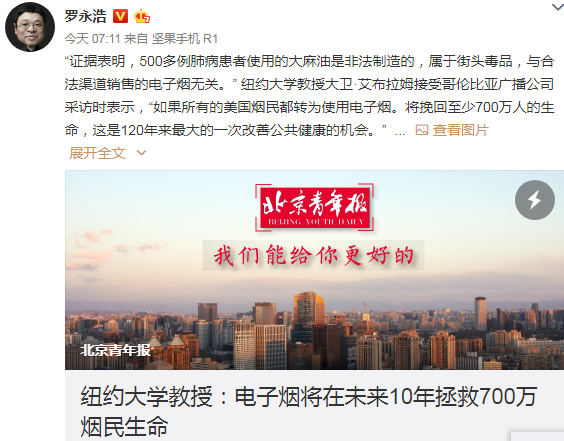 即使如此,但是作为跟电子烟行业有关联的锤子科技CEO罗永浩也依旧看好该行业,他援引北京青年报的报道称: