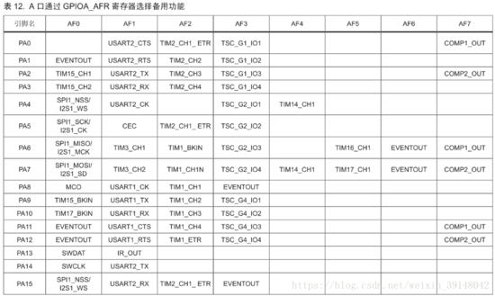 GPIO功能复用:《 STM32F0数据手册》可以方便查看(P29-P30)