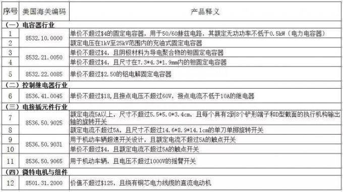 在2019年7月9日,美国曾豁免了“清单1”340亿美元商品中的110种中国进口商品的25%高额关税。其中包括电容器、控制继电器、电接插元件以及微特电机与组件四个细分行业中的部分产品,共计12种。