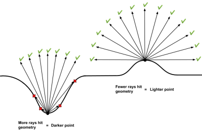 环境遮挡效果可以根据模型的几何形状预先计算,如果同等强度的光从四面八方照射到物体上,物体暴露的部分则越亮,而封闭或遮挡的部分则越暗。阴影的数量通常是通过从物体表面的点向四面八方投射的光线来计算的,这些光线照射物体某一部分的比例越大,那么这一部分在环境遮挡映射图中的颜色就越深。