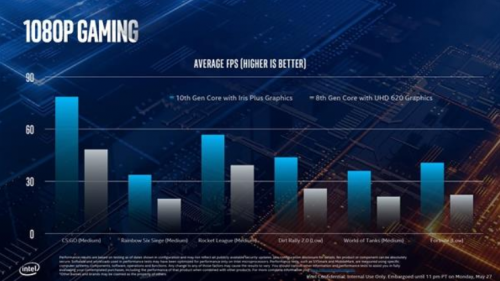 最后,十代酷睿处理器的GPU也变了,从之前的Gen9架构大幅升级到了Gen11架构,集成多达64个EU单元,所以浮点性能翻倍到了1TFLOPS,这个性能已经达到了一些独显的水平,所以十代酷睿笔记本的游戏性能进步是最惊人的。