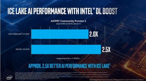 Ice Lake处理器支持了Intel的DLBoost加速指令集,AI性能是前代产品的2到2.5倍。