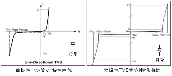 TVS瞬态抑制二极管按照极性划分可分为单极性TVS和双极性TVS管,如图(3)所示为两种不同TVS管的V-I特性曲线图