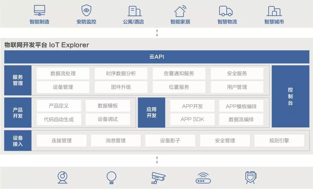 IoT Explorer 不仅聚焦于为传统设备制造业提供一站式单品智能化服务,还通过与模组厂商的合作、整合腾讯云 AI、视频、大数据等产品能力,结合 IoT Explorer 平台提供的小程序、APP 开发能力,助力传统设备制造业产品升级。IoT Explorer 覆盖了公寓酒店、安防、制造、物流、文旅、出行、智慧城市等领域,可以帮助用户快速接入海量设备,灵活选择 IoT Explorer 提供的服务以及工具,降低用户的研发运维成本,提升业务的运营效率。