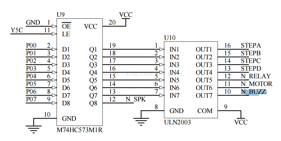 找到这里我们可以知道蜂鸣器是用U9这个锁存器控制的Q7为0蜂鸣器工作,那么我们继续找U9的控制口Y5C