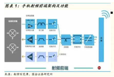 下面解剖一下射频前端芯片,看看它里面都有哪些“脏器”:功率放大器(PA),天线开关(Switch)、滤波器(Filter)、双工器(Duplexer和Diplexer)和低噪声放大器(LNA)等,在多模/多频终端中发挥着核心作用。