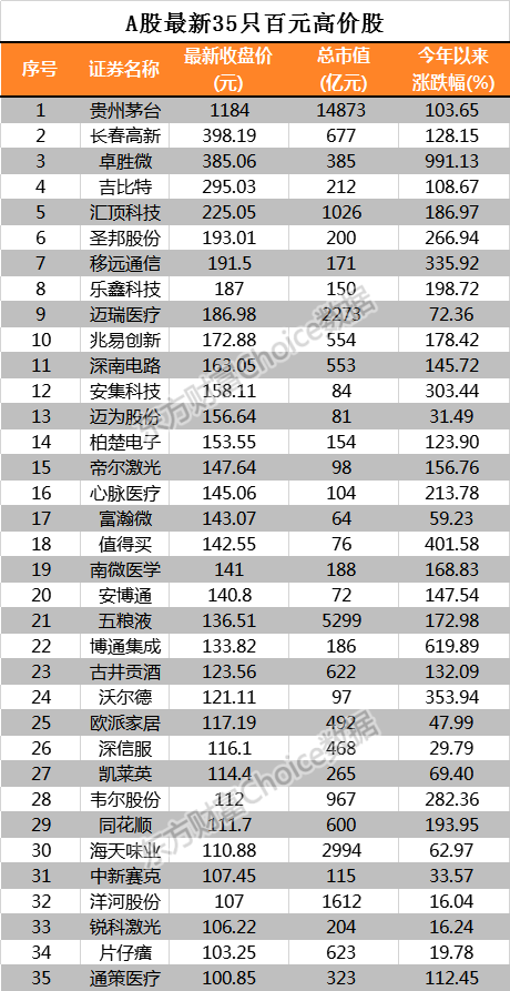 东方财富显示,截至9月24日,A股市场百元股合计35只。