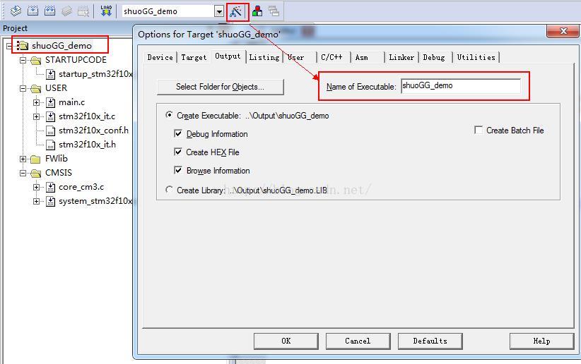 1.文件夹改名,这里我改为shuoGG_project,打开工程(在USER里),改改output名和文件名什么的,当然不改也没什么影响;