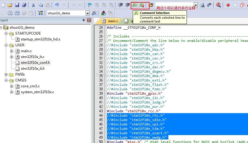 5.在stm32f10x_conf.h注释掉用不到的外设,可以减少一点编译时间,但是外设c文件依旧会编译,所以只是省了几秒而已;