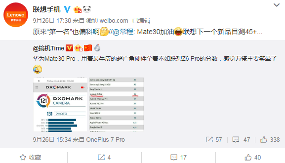 2019年09月27日 | 常程回应联想Z6 Pro广角评分超过华为Mate30 Pro