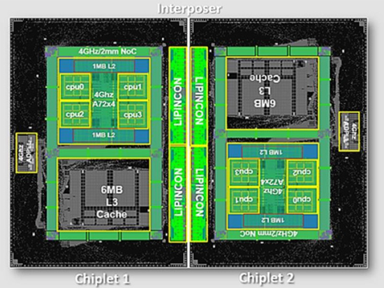 据了解,此款小芯片系统建设在CoWoS中介层上,由双个7纳米生产小芯片组成,每一小芯片包含4个Arm Cortex- A72处理器及1个芯片内建跨核心网状互连总线,小芯片内互连的功耗效益达0.56pJ/bit、频宽密度为1.6Tb/s/mm2、0.3伏LIPINCON界面速度达8GT/s 且频宽速率为320GB/s。