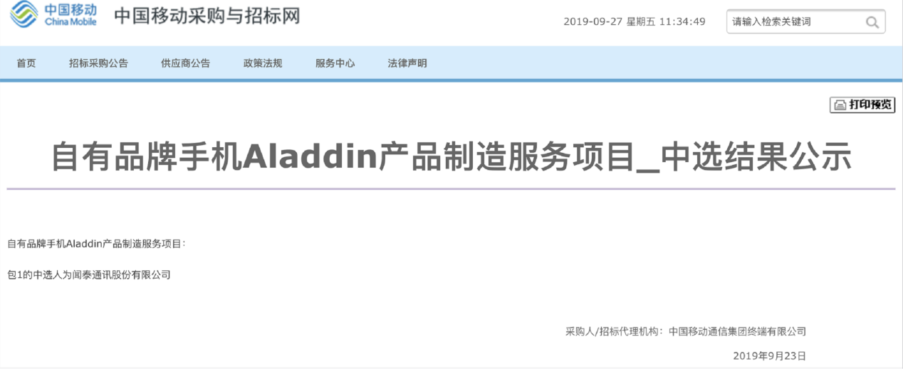 9月23日,中国移动采购和招标网发布自有品牌手机Aladdin产品制造服务项目中选结果公示,闻泰科技全资子公司闻泰通讯股份有限公司成功中选。