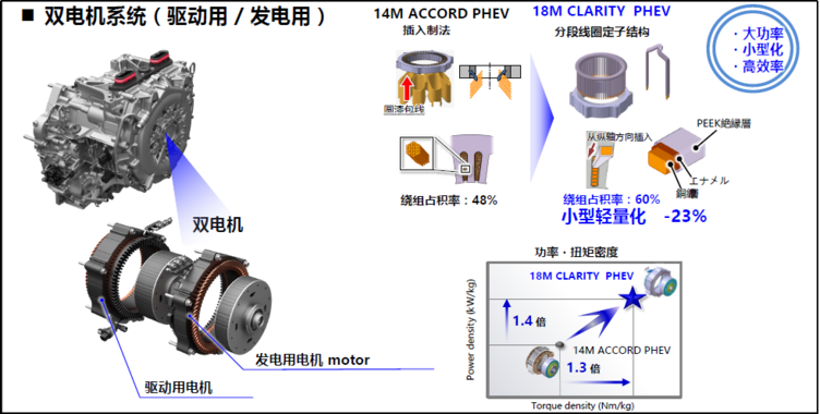 首先SPORT HYBRID e+对双电机系统进行了优化,电机的制作工艺由以往的圆形绕组方式变为方形线圈,这使得电机总体积中线圈的占比从原来的48%上升到60%,而电机总体实现了23%的小型化,功率密度比以往提高到1.4倍,扭矩密度提高到1.3倍。