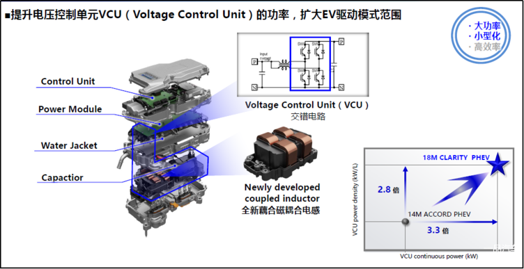 在PCU(动力控制单元)方面,通过提升电压控制单元VCU(电压控制单元)的功率,各个电动化组件之间的运转更加高效,使得EV驱动行驶的最高时速可达到160km,扩大了EV驱动模式的使用范围。