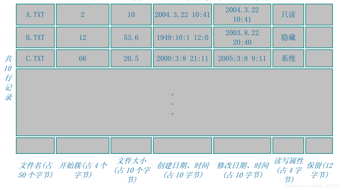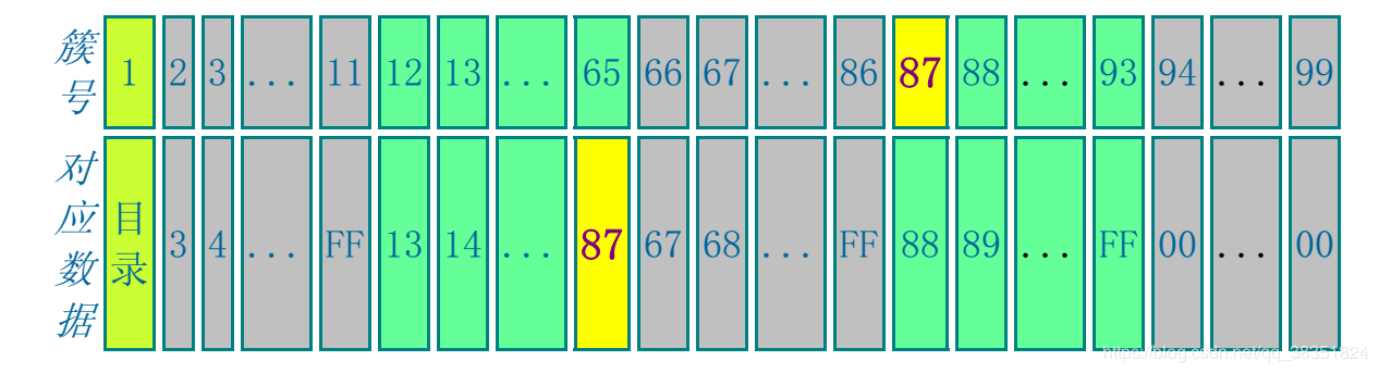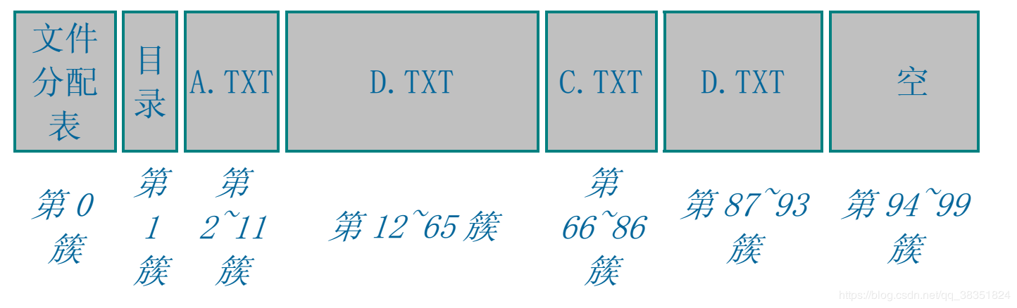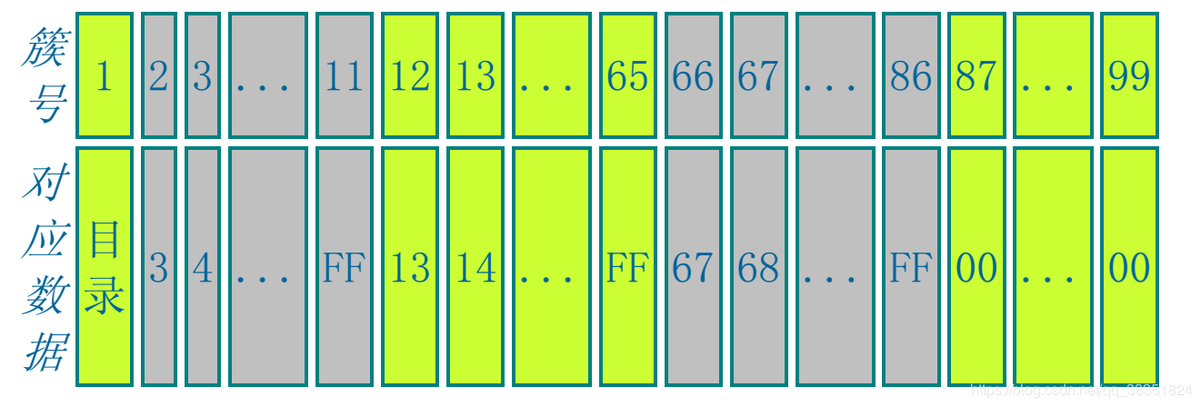 文件 a.txt 我们根据目录项中指定的 a.txt 的首簇为 2,然后找到文件分配表的第 2 簇记录,上面登记 的是 3,就能确定下一簇是 3。找到文件分配表的第 3 簇记录,上面登记的 是 4,就能确定下一簇是 4......直到指到第 11 簇,发现下一个指向是 FF,就是结束。文件便读取完毕。