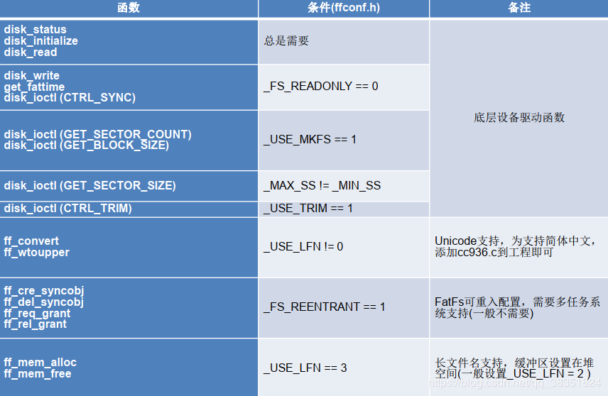 • diskio.c:包含底层存储介质的操作函数,这些函数需要用户自己实现,主要添加底层驱动函数。