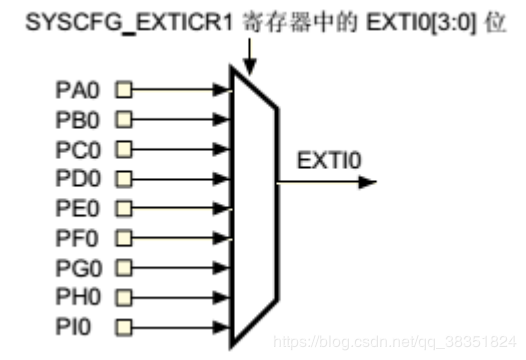 EXTI0 至 EXTI15 用于 GPIO,通过编程控制可以实现任意一个 GPIO 作为 EXTI 的输入源。由表 17-1 可知, EXTI0 可以通过 SYSCFG 外部中断配置寄存器1(SYSCFG_EXTICR1)的 EXTI0[3:0]位选择配置为 PA0、 PB0、 PC0、 PD0、 PE0、 PF0、PG0、 PH0 或者 PI0,见图 17-2。其他 EXTI 线(EXTI 中断/事件线)使用配置都是类似的。