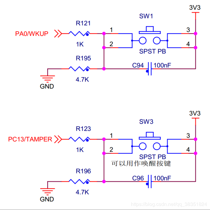 轻触按键在按下时会使得引脚接通,通过电路设计可以使得按下时产生电平变化,见图 15-1。