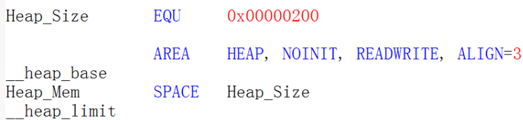 开辟堆的大小为 0X00000200(512 字节),名字为 HEAP, NOINIT 即不初始化,可读可写, 8(2^3)字节对齐。 __heap_base 表示对的起始地址, __heap_limit 表示堆的结束地址。堆是由低向高生长的,跟栈的生长方向相反。