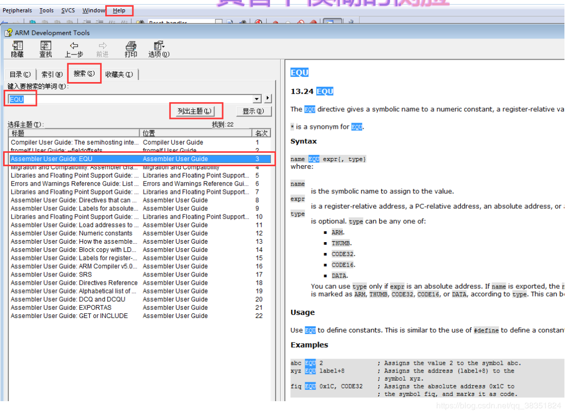 在讲解启动代码的时候,会涉及到 ARM 的汇编指令和 Cortex 内核的指令,有关Cortex 内核的指令我们可以参考《CM3 权威指南 CnR2》第四章:指令集。剩下的 ARM 的汇编指令我们可以在 MDK->Help->Uvision Help 中搜索到,以 EQU 为例,检索如下: