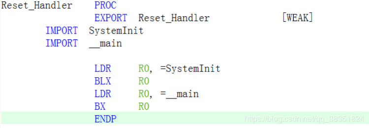 WEAK:表示弱定义,如果外部文件优先定义了该标号则首先引用该标号,如果外部文件没有声明也不会出错。这里表示复位子程序可以由用户在其他文件重新实现,这里并不是唯一的。