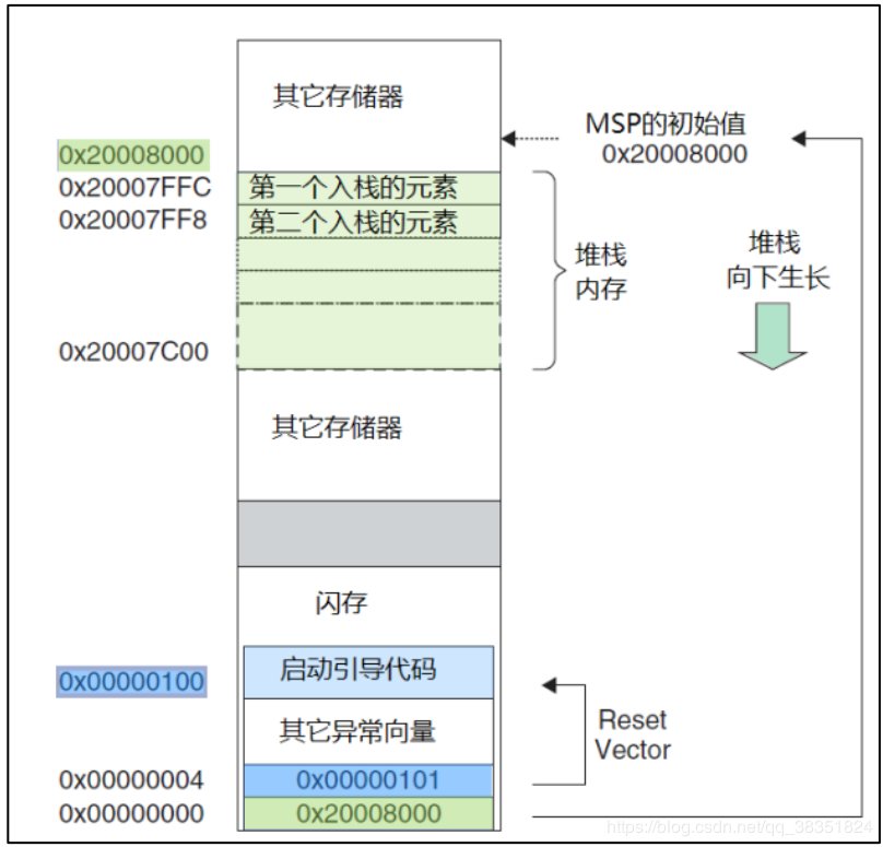 因为 CM3 使用的是向下生长的满栈,所以 MSP 的初始值必须是堆栈内存的末地址加1。举例 来说,如果我们的堆栈区域在 0x20007C00-0x20007FFF 之间,那么 MSP 的初始值就必须是 0x20008000。