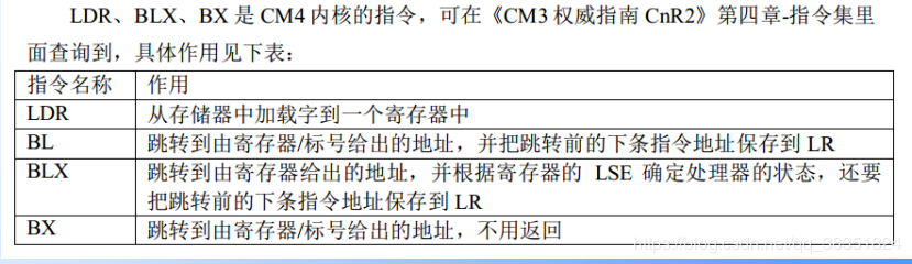 LDR、 BLX、 BX 是 CM4 内核的指令,可在《CM3 权威指南 CnR2》第四章-指令集里面查询到,具体作用见下表: