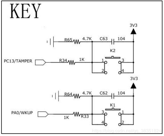 从按键的原理图可知,这些按键在没有被按下的时候, GPIO 引脚的输入状态为低电平(按键所在的电路不通,引脚接地),当按键按下时, GPIO 引脚的输入状态为高电平(按键所在的电路导通,引脚接到电源)。只要我们检测引脚的输入电平,即可判断按键是否被按下。