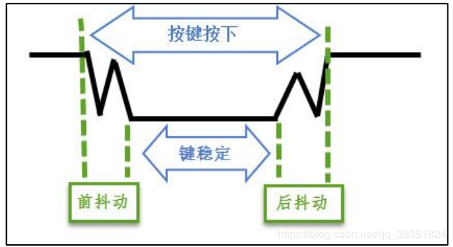 按键机械触点断开、闭合时,由于触点的弹性作用,按键开关不会马上稳定接通或一下子断开,使用按键时会产生图 10-1 中的带波纹信号,需要用软件消抖处理滤波,不方便输入检测。本实验板连接的按键带硬件消抖功能,见图 10-2,它利用电容充放电的延时,消除了波纹,从而简化软件的处理,软件只需要直接检测引脚的电平即可。