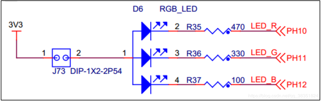 这些 LED 灯的阴极都是连接到 STM32 的 GPIO 引脚,只要我们控制 GPIO 引脚的电平输出状态,即可控制 LED 灯的亮灭。图中左上方,其中彩灯的阳极连接到的一个电路图符号“