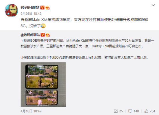 该博主称,Mate X将搭载麒麟990 5G处理器,另外,华为Mate X目前整个生命周期规划市生产30万台左右,算是一款试水产品。