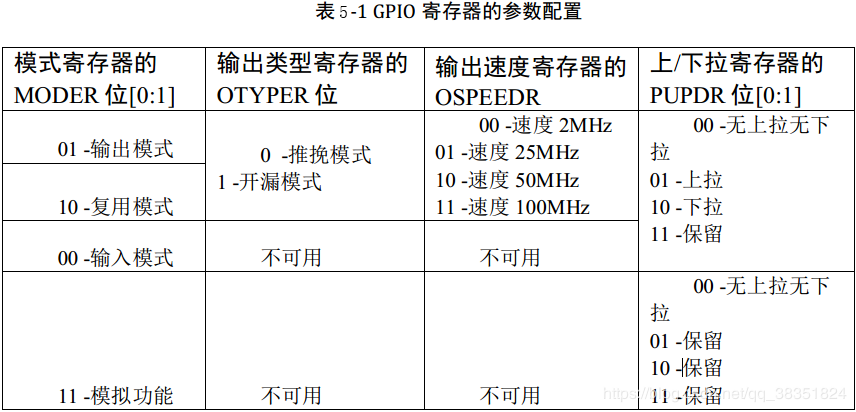 通过对 GPIO 寄存器写入不同的参数,就可以改变 GPIO 的应用模式,再强调一下,要了解具体寄存器时一定要查阅《STM32F4xx 参考手册》中对应外设的寄存器说明。在GPIO 外设中,通过设置“模式寄存器 GPIOx_MODER”可配置 GPIO 的输入/输出/复用/模拟模式,“输出类型寄存器 GPIOx_OTYPER”配置推挽/开漏模式,配置“输出速度寄存器 GPIOx_OSPEEDR”可选 2/25/50/100MHz 输出速度,“上/下拉寄存器 GPIOx_PUPDR”可配置上拉/下拉/浮空模式,各寄存器的具体参数值见表 5-1。