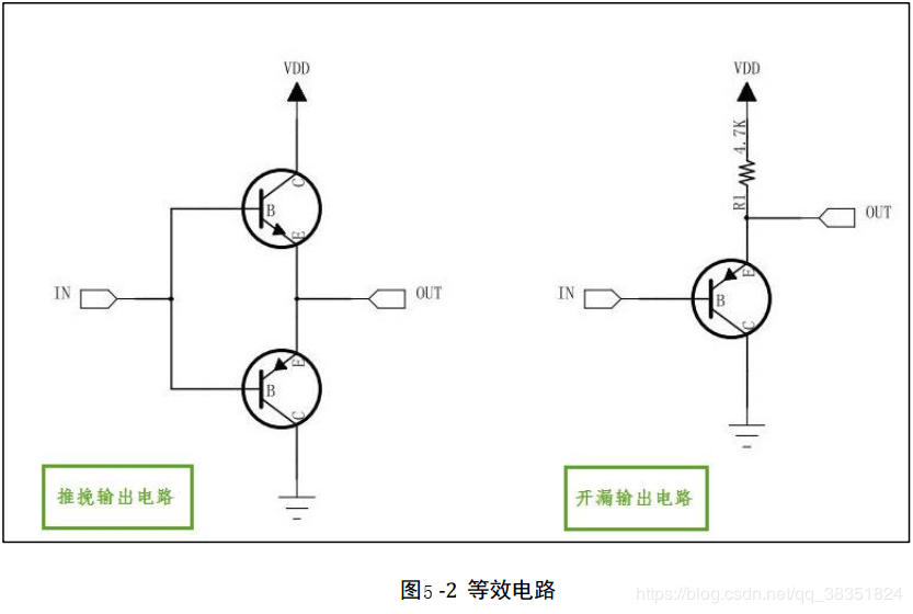 而在开漏输出模式时,上方的 P-MOS 管完全不工作。如果我们控制输出为 0,低电平,则 P-MOS 管关闭, N-MOS 管导通,使输出接地,若控制输出为 1 (它无法直接输出高电平)时,则 P-MOS 管和 N-MOS 管都关闭,所以引脚既不输出高电平,也不输出低电平,为高阻态。为正常使用时必须接上拉电阻(可用 STM32 的内部上拉,但建议在 STM32 外部再接一个上拉电阻),参考图 5-2 中的右侧等效电路。它具“线与”特性,也就是说,若有很多个开漏模式引脚连接到一起时,只有当所有引脚都输出高阻态,才由上拉电阻提供高电平,此高电平的电压为外部上拉电阻所接的电源的电压。若其中一个引脚为低电平,那线路就相当于短路接地,使得整条线路都为低电平, 0 伏。