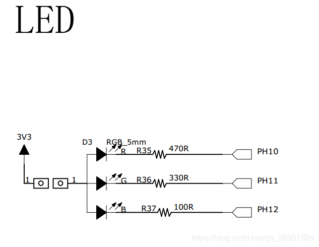 图中从 3 个 LED 灯的阳极引出连接到 3.3V 电源,阴极各经过 1 个电阻引入至 STM32的 3 个 GPIO 引脚 PH10、 PH11、 PH12 中,所以我们只要控制这三个引脚输出高低电平,即可控制其所连接 LED 灯的亮灭。如果您的实验板 STM32 连接到 LED 灯的引脚或极性不一样,只需要修改程序到对应的 GPIO 引脚即可,工作原理都是一样的。