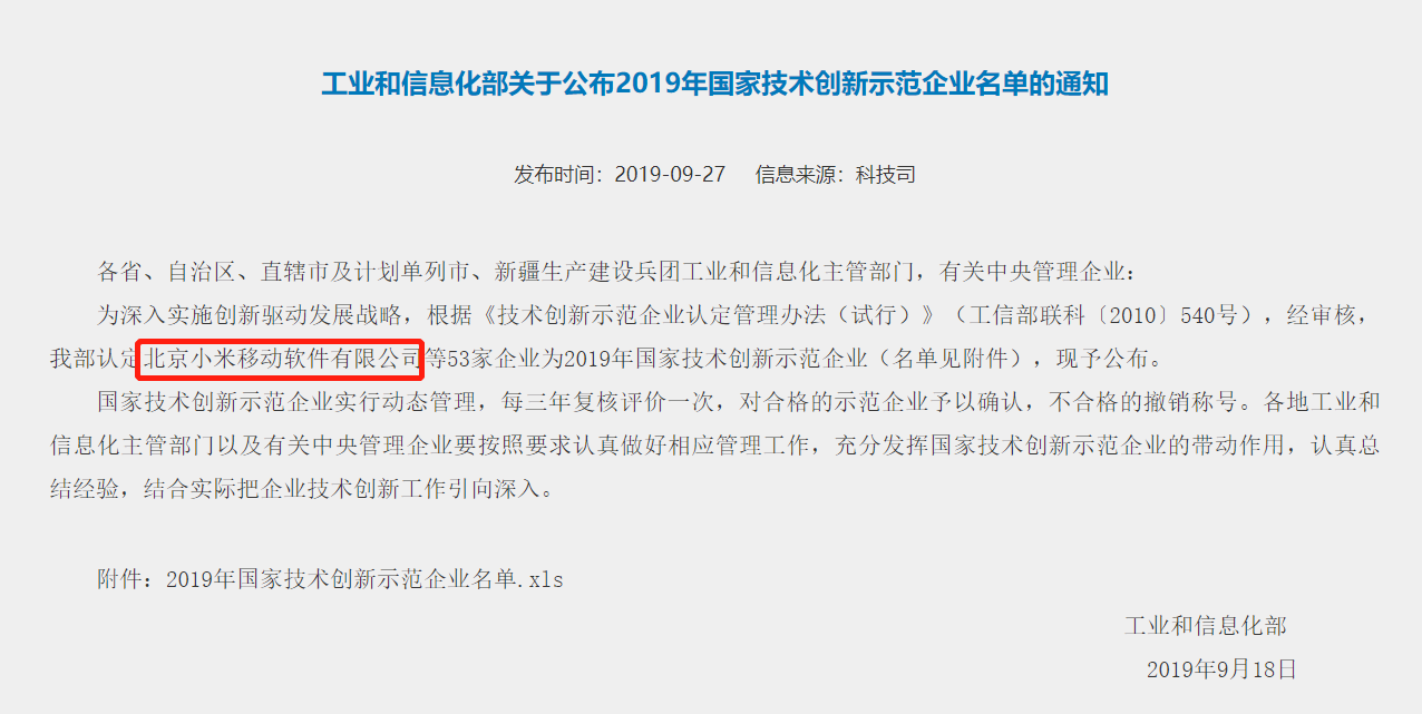 2019年09月29日 | 小米上榜了“2019年国家技术创新示范企业名单”