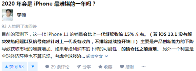 从李楠的分析看,他是看衰苹果2020年的市场前景。