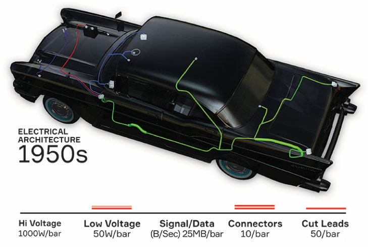 这个看似艰深的专业词汇其实很好理解,早在1950年代,随着车载收音机、整车灯光系统及用电器的普及与完善,最初的汽车电子架构就应运而生了。早期的系统结构非常简单,严格的说甚至不能被称为架构,而叫做汽车电路更合适。12伏电瓶、简单的线束和保险盒就是他们全部的构成。