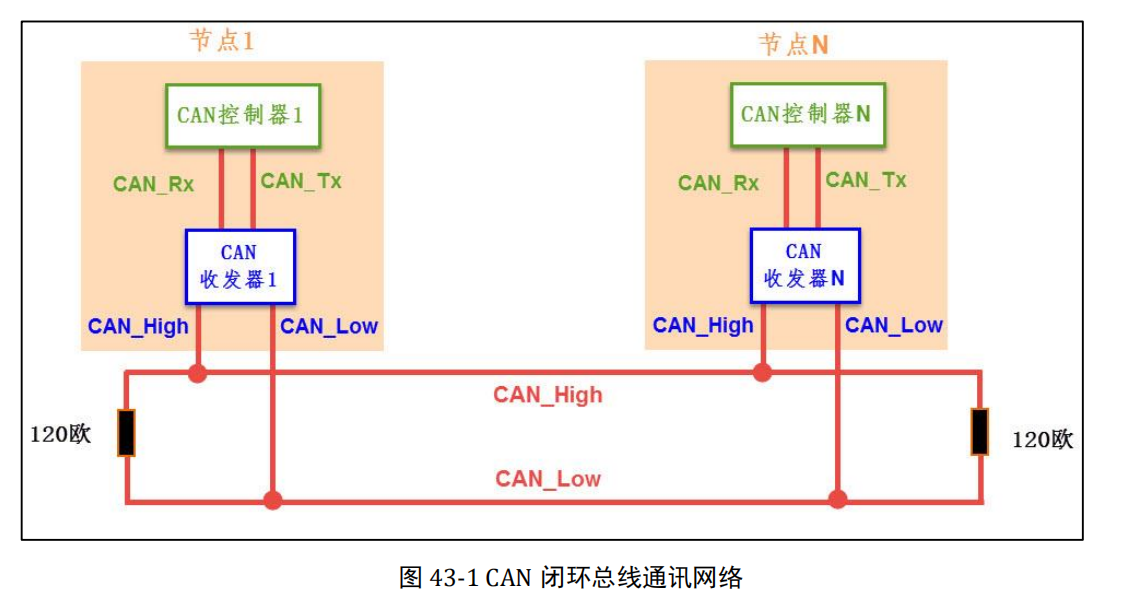 由于 CAN 属于异步通讯,没有时钟信号线,连接在同一个总线网络中的各个节点会像串口异步通讯那样,节点间使用约定好的波特率进行通讯,特别地,CAN 还会使用“位同步”的方式来抗干扰、吸收误差,实现对总线电平信号进行正确的采样,确保通讯正常。