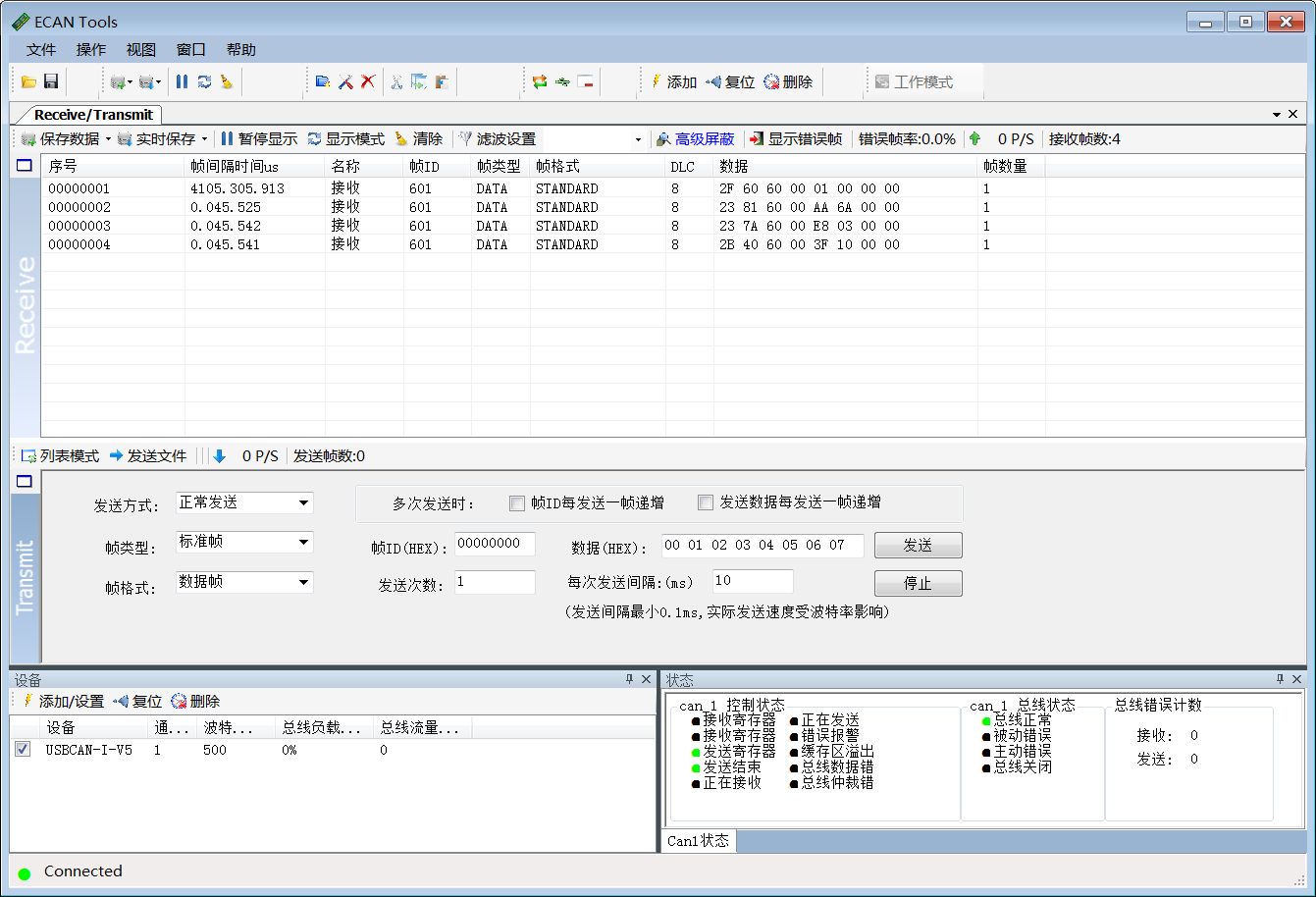 使用USB转CAN盒,打开ecantools软件,波特率为500k