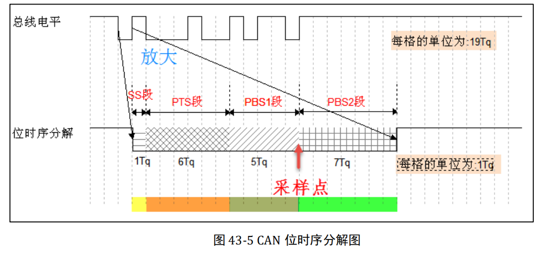 为了实现位同步,CAN 协议把每一个数据位的时序分解成如图 43-5 所示的 SS 段、PTS 段、PBS1 段、PBS2 段,这四段的长度加起来即为一个 CAN 数据位的长度。分解后最小的时间单位是 Tq,而一个完整的位由 8~25 个 Tq 组成。为方便表示,图中的高低电平直接代表信号逻辑 0 或逻辑 1(不是差分信号)。