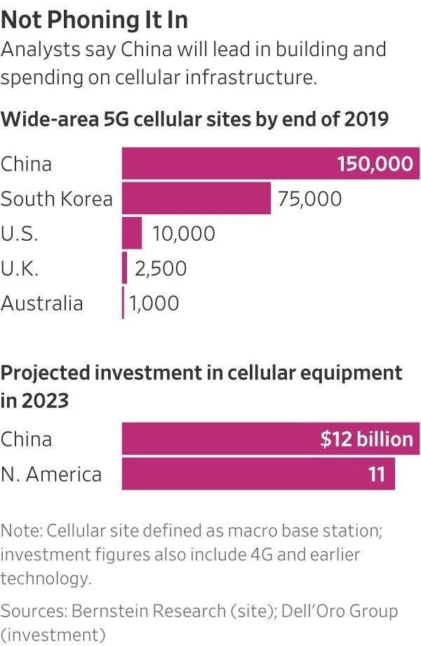 伯恩斯坦公司的莱恩说,到今年年底,中国将有至少15万个5G广域基站可供公众使用,这一数字将超过任何其他国家。伯恩斯坦公司估计,韩国将以7.5万个此类基站位居第二,而美国到今年年底将拥有1万个5G基站。