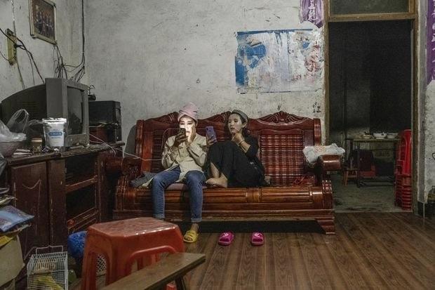 图示:铜关村的两名年轻姑娘正在拿智能手机连接网络看视频。
