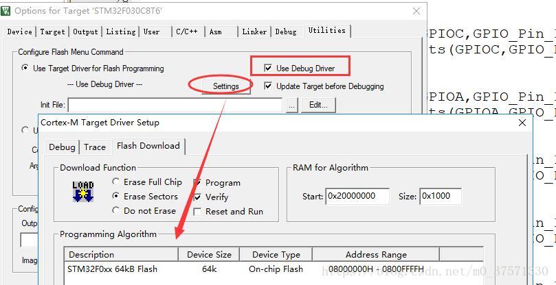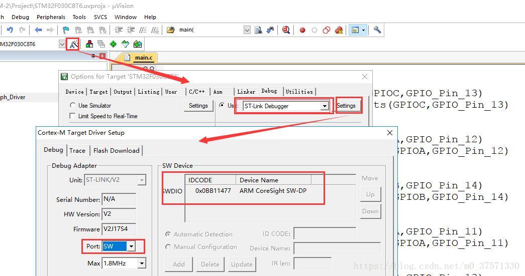 3:MDK V5 设置如下图,在SW Device 框中,如果显示了IDCODE Device Name 信息,则表示ST-Link V2识别到了单片机。