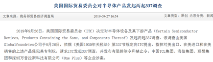 商务部官方网站消息,2019年9月26日,美国国际贸易委员会(ITC)决定对半导体设备及其下游产品(Certain Semiconductor Devices, Products Containing the Same, and Components Thereof)发起两起337调查。