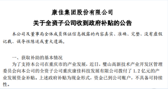 此外,公告显示,重庆康佳科技发展有限公司获得的上述政府补贴不用于购建或以其他方式形成的长期资产,故为与收益相关的政府补助。